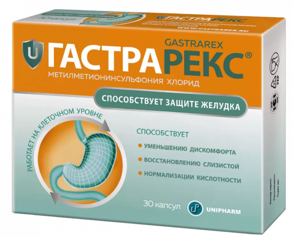 Гастрарекс содержит S-метилметионинсульфония хлорид — витаминоподобное вещество (витамин U), активированную форму незаменимой аминокислоты – метионина, необходимого для синтеза всех белковых соединений; активно влияет на секреторную функцию желудка.